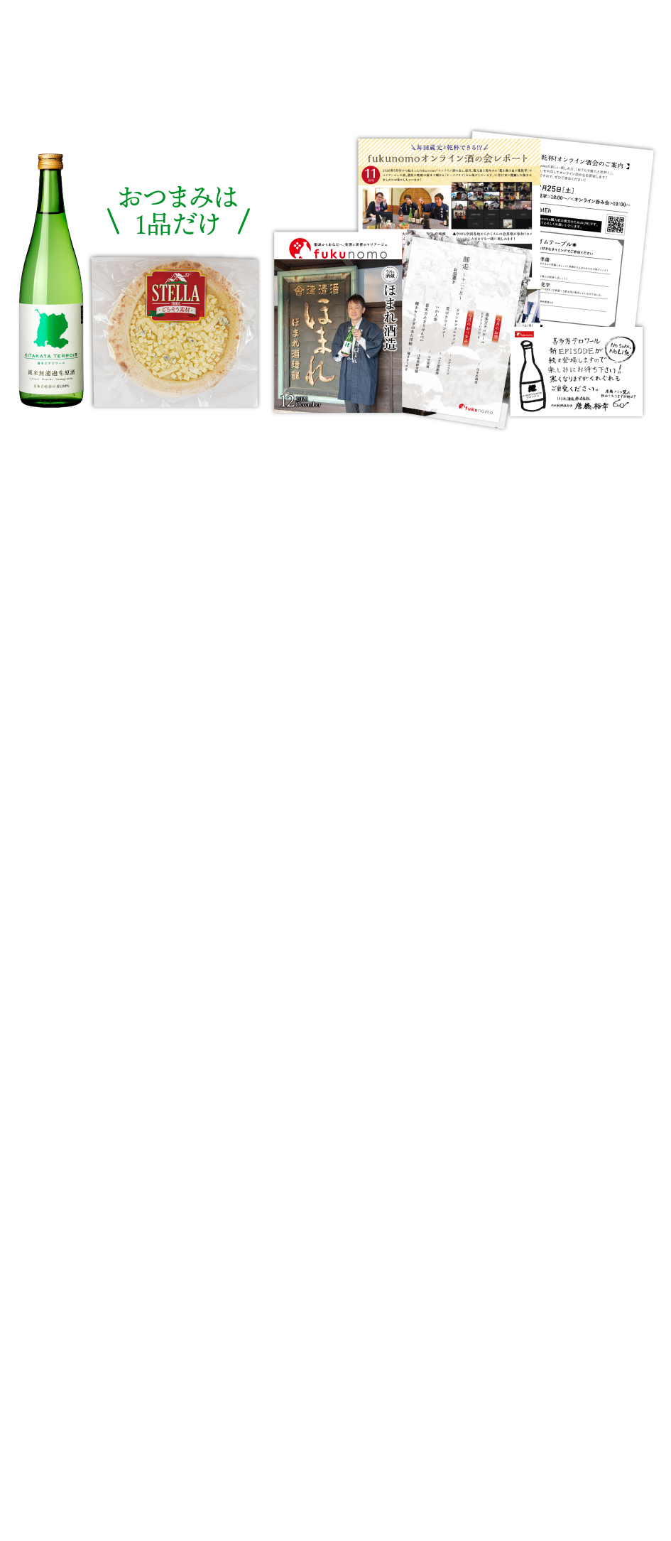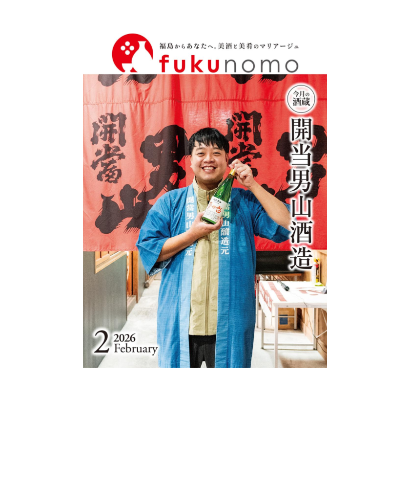 全国新酒鑑評会金賞受賞数9回連続日本一を誇る福島県には60を超える蔵があります。そのどれもが個性豊かで、美味しい酒を醸しています。 fukunomoが素晴らしいことは県内各々の酒ばかりで無く、醸す人間の想いを伝えて戴けること。加えて、福島県産の肴の数々が送られて来ます。こんな食材があったのか? こんな食材が意外にお酒に合うんだな? など小さな発見があり、これが醍醐味かなと思います。 世界に一つだけの蔵で醸された酒と県産肴のマリアージュをぜひとも楽しまれてください。